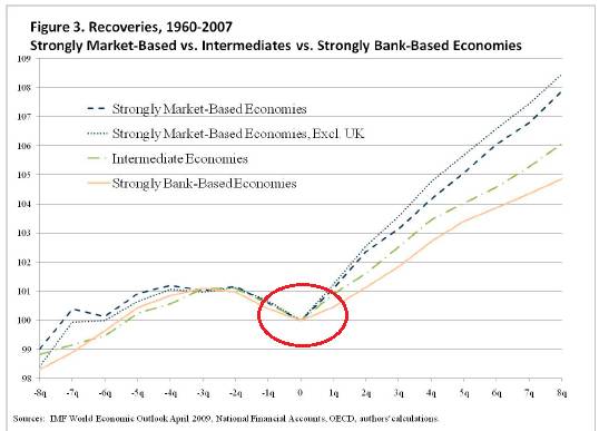 这里显示的是IMF两位经济学家在2007年所做的一个研究。他们研究了1960-2007近50年的历史中17个OECD发达国家的经济发展情况,期间这些国家共发生大大小小80次经济金融危机。统计表明,危机后复苏速度最快的总是金融体系以资本市场主导的四个国家,即美国、英国、加拿大、澳大利亚,而复苏最慢的无一例外都是银行主导的四个国家:奥地利、葡萄牙、西班牙和比利时。两者代表了两种不同的资源配置方式,资本市场比较发达的金融体系资源配置方式比较市场化,背后是比较市场化的经济体系,在每次危机之后反弹的速度比较快,经济体比较有弹性,比较可持续发展。而商业银行主导的金融体制资源配置方式的市场化程度低,每次危机后反弹的速度比较慢。发展经济,遇到挫折或危机是常态,如果每一次危机后你都能迅速反弹,久而久之就崛起了,如果每次都复苏很慢,久而久之就衰落了。