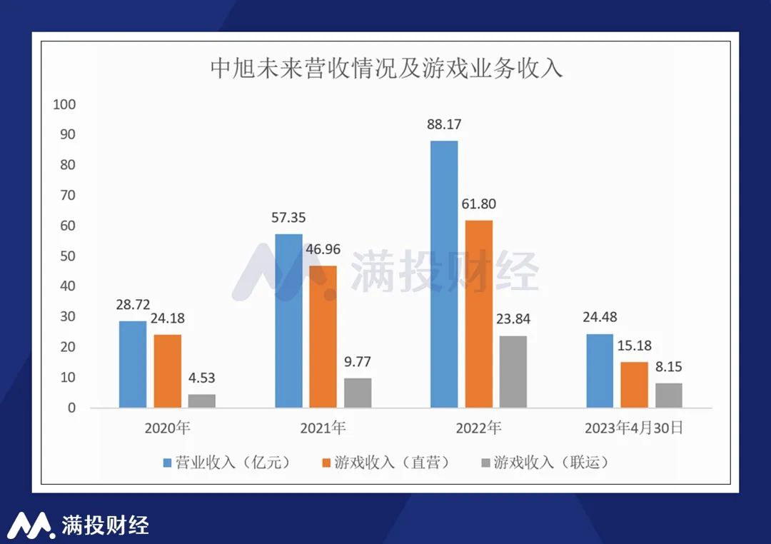 中旭未来主要经营三项业务,其中包括网络游戏业务、速食食品业务及潮玩业务。2020年、2021年、2022年以及截至2023年4月30日止的四个月,中旭未来的营收分别为28.72亿元、57.35亿元、88.17亿元、24.48亿元,其营收规模在已经上市的国内游戏公司中属于较高水平,或有望在2023年内挤进“百亿俱乐部”。