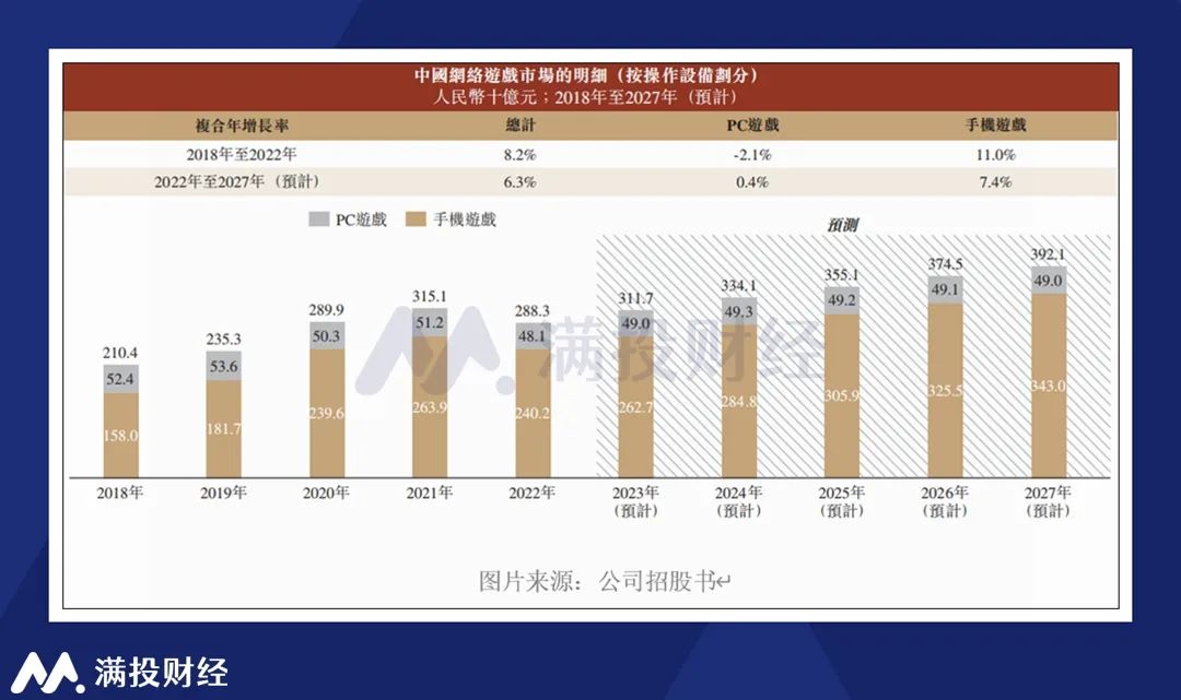 从2015年成立贪玩游戏开始,中旭未来目前已走过了8个年头,国内游戏市场迎来了较大的变化,一方面是在摆脱版号寒冬后,行业回到了景气发展阶段。根据弗若斯特沙利文数据显示,按用户支出计,中国网络游戏市场规模由2018年的2,104亿元增加至2022年的2,883亿元,复合年增长率为8.2%,并预期将于2027年达到3,921亿元,2022年至2027年的复合年增长率为6.3%。