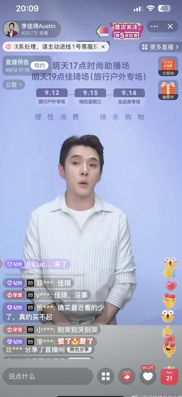 9月11日晚8点8分,李佳琦出现在直播间为这两天的言论风波道歉,从第一句话开始,起身站立的李佳琦就出现数次哽咽。一天前,因为在直播间里“怒怼网友”,李佳琦被推上风口浪尖,一天内微博创下13个热搜词条。