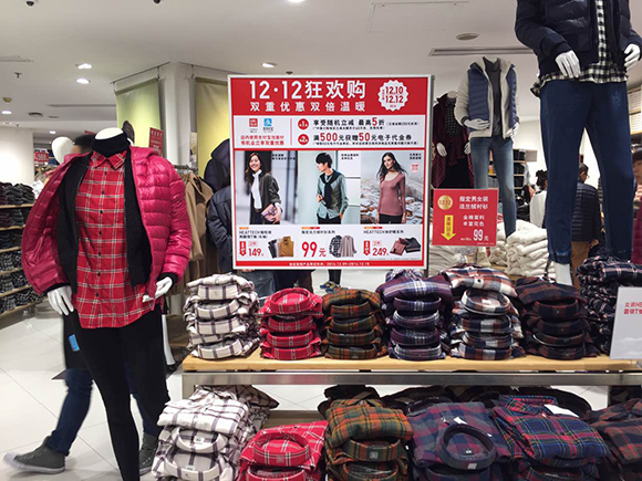 界面新闻记者也参与了不同品类商品品类的消费体验。在人流量很大的优衣库,到处都是打折、满减的牌子,“随机立减、最高5折”、“满500元获赠50元电子代金券”。优衣库是双十一的赢家,只有了2分53秒销售额破亿,并登顶女装品类第一,成功从线上导流到线下。