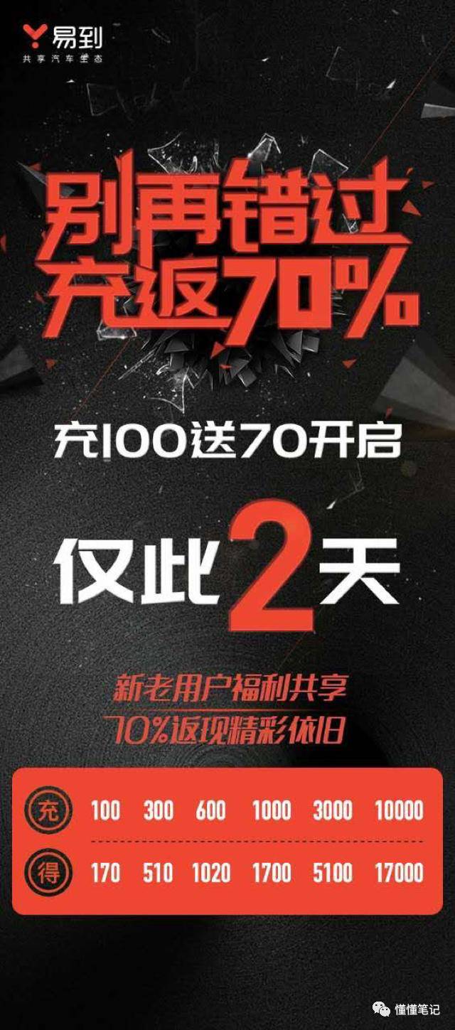 从滴滴优步结合以后,网约车的补贴就越来越少了,烧钱大战基本就要结束了。然而,易到却特立独行继续补贴。究其原因自然就联想到前段时间易到拖欠供应商款项被起诉的事情,也就是说易到的资金链出了问题。此前长达7个月的100%充返狂揽60亿,易到发现这是最快的资金回流方式。这次70%充返,意图也在填补资金流。但要知道,这种充返,圈的钱越多,将来要补的窟窿就越大。
