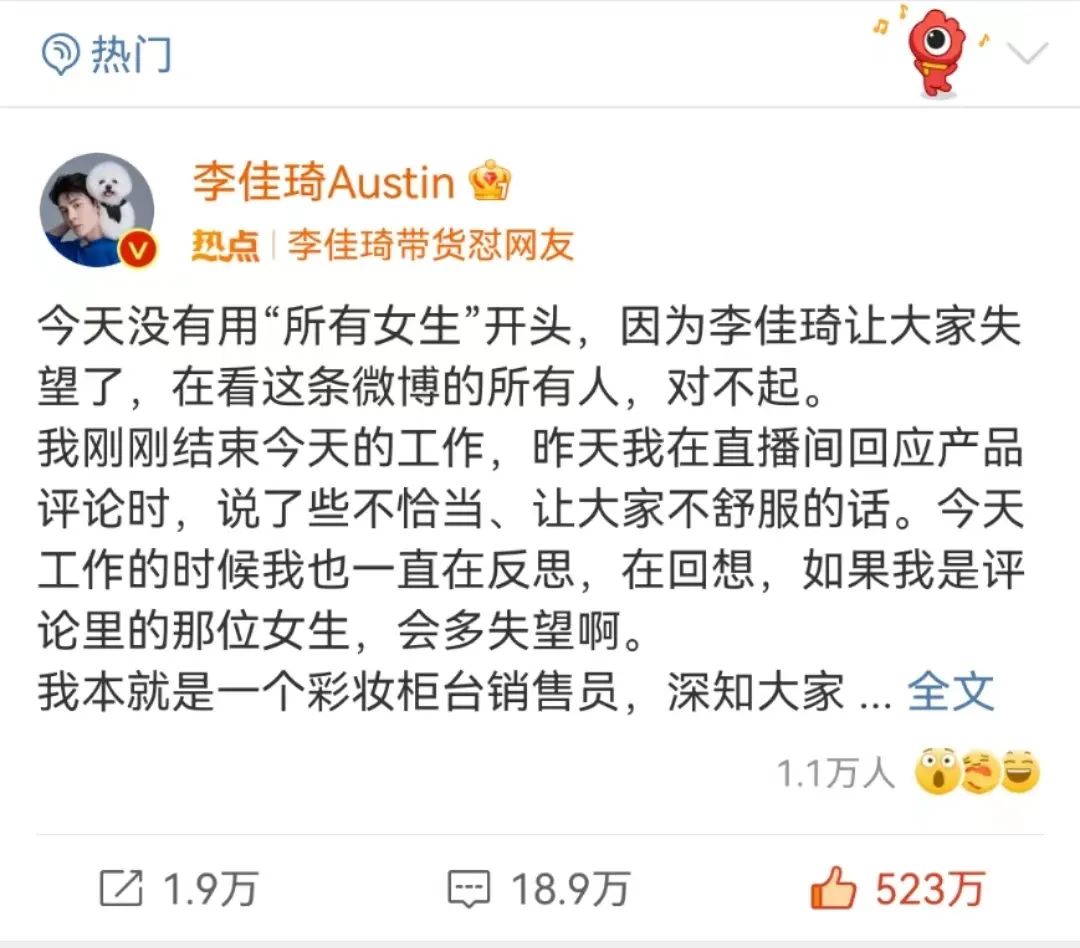 “今天没有用‘所有女生’开头,因为李佳琦让大家失望了,在看这条微博的所有人,对不起。任何人都可以对直播间的产品提出意见和想法。我作为主播应该一直带给大家积极的正能量,并学会控制情绪......”