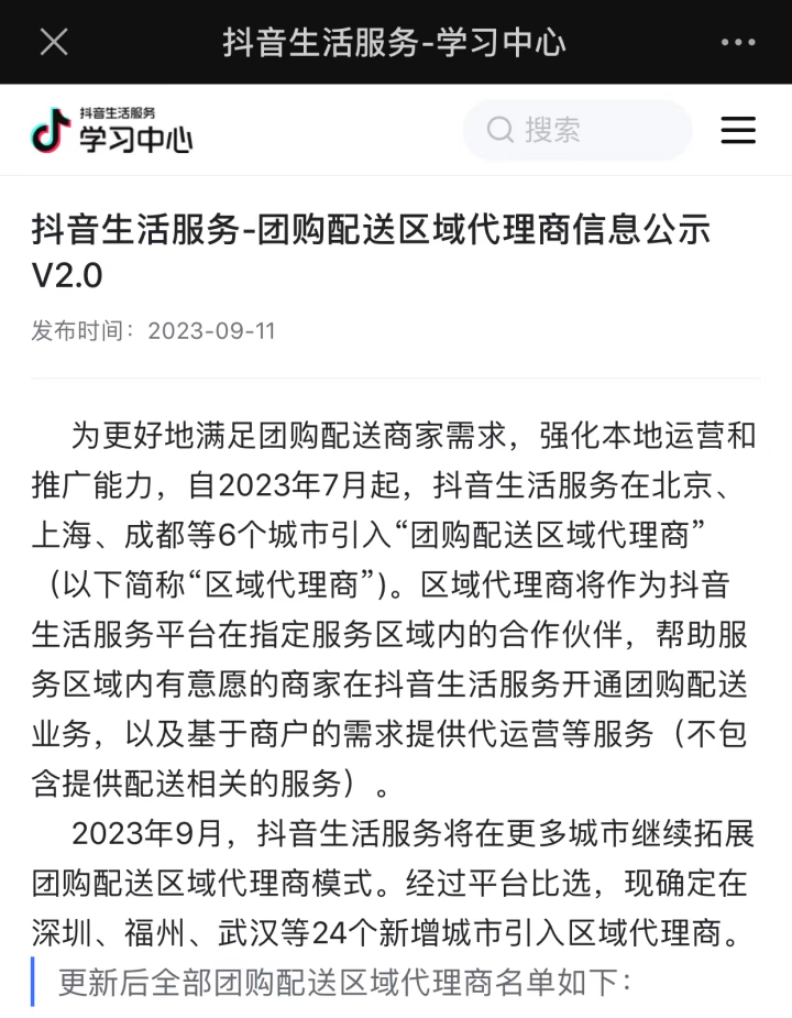 为更好地满足团购配送商家需求,强化本地运营和推广能力,自2023年7月起,抖音生活服务在北京、上海、成都等6个城市引入“团购配送区域代理商”(以下简称“区域代理商”)。区域代理商将作为抖音生活服务平台在指定服务区域内的合作伙伴,帮助服务区域内有意愿的商家在抖音生活服务开通团购配送业务,以及基于商户的需求提供代运营等服务(不包含提供配送相关的服务)。