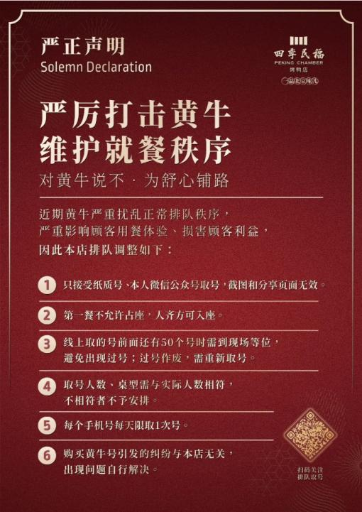 如今年7月四季民福通过官方微信公众号发布了一篇《严厉打击黄牛,维护用餐秩序》的声明,“胡大饭馆”也推出了多项举措,抵制黄牛倒号。