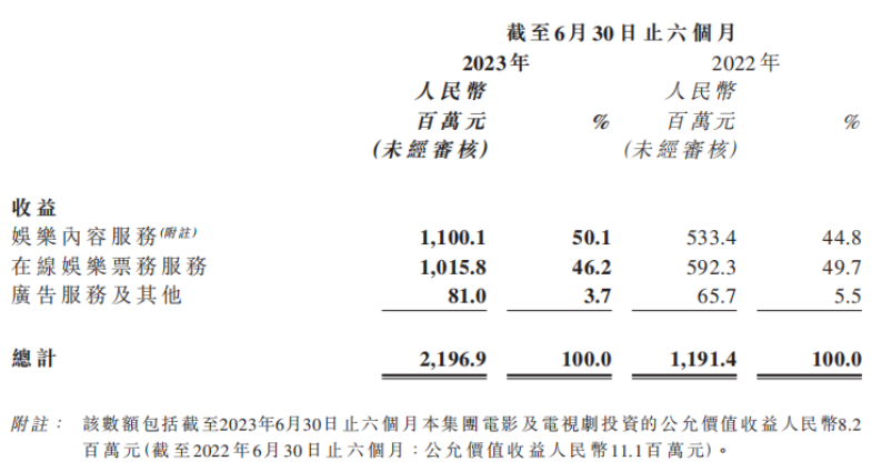 今年上半年,猫眼娱乐强势进入电影产业链上游,娱乐内容服务超过了在线票务服务,带来11亿元收入。