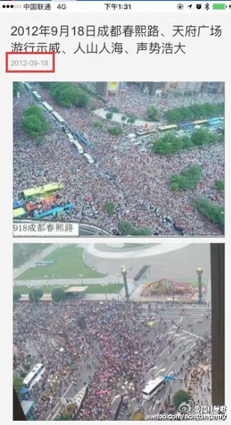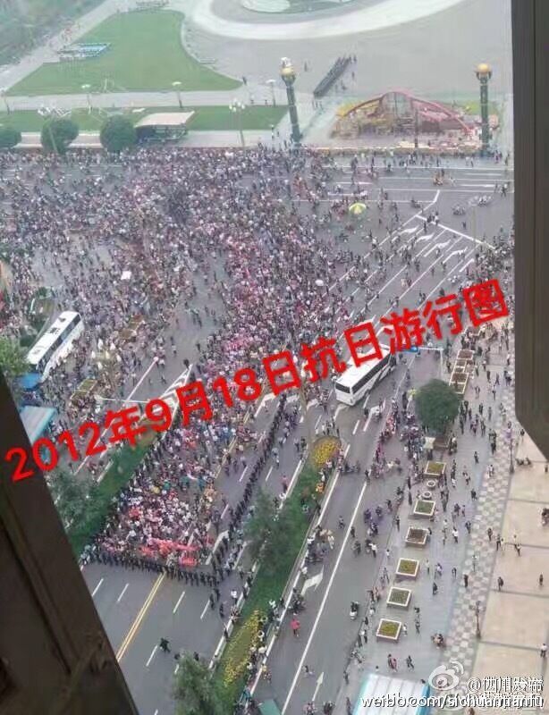 根据@四川发布发布的图片,上述“成都市民纷纷聚集到天府广场”的图片实乃2012年9月18日的抗日游行图。