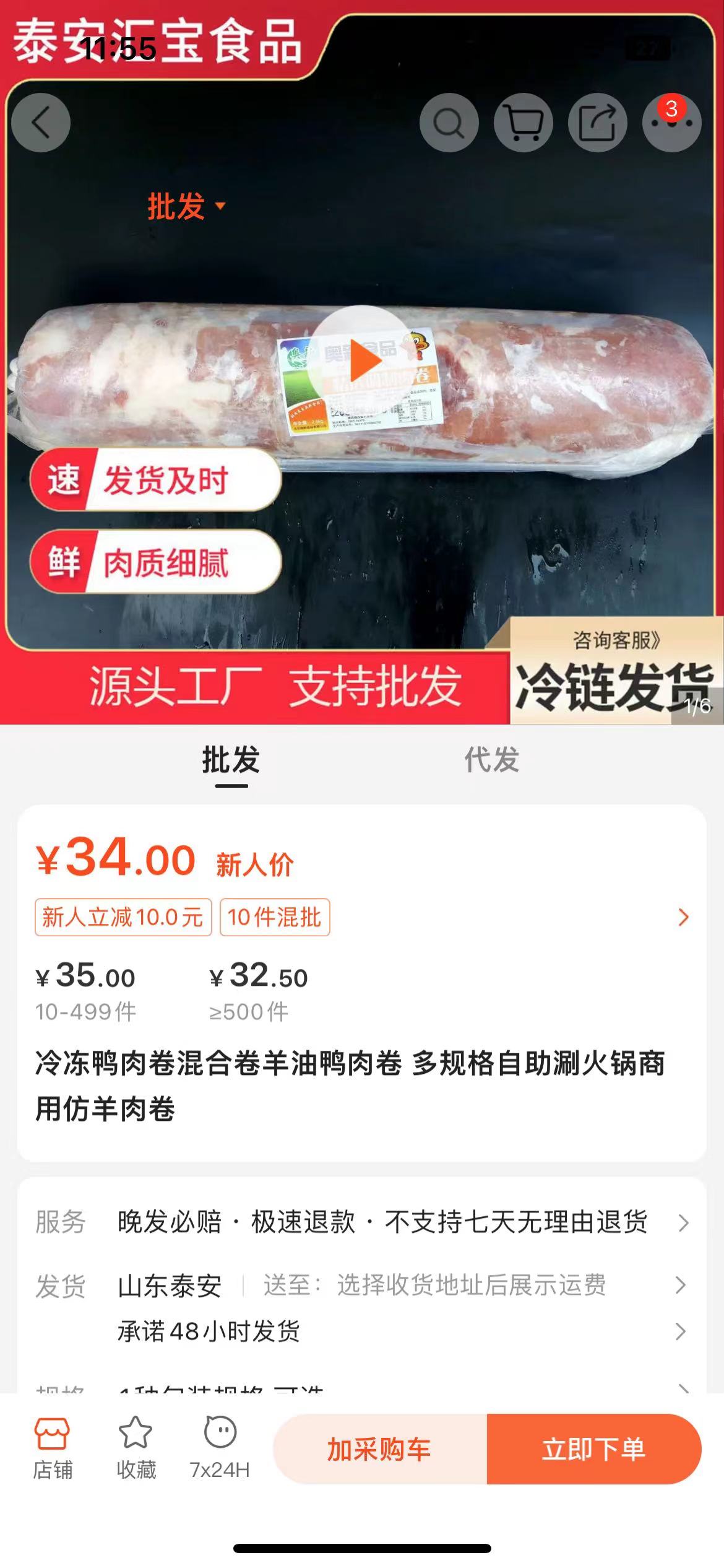如果以鸭肉混合羊肉,价格就十分低廉。以下图的精选调制肉卷为例,1688上以35元5斤的售价销售,折合为14元/公斤。