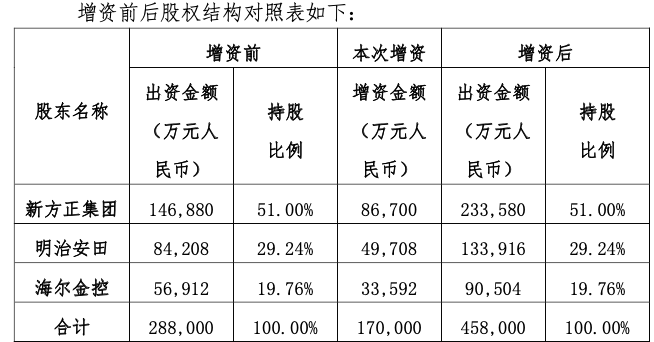 据了解,此次增资的资金来自北大方正人寿现有股东。其中,新方正控股发展有限责任公司出资8.67亿元人民币,占股51.00%;明治安田生命保险相互会社出资5.97亿元人民币,占股29.24%;海尔集团(青岛)金盈控股有限公司出资3.36亿元人民币,占股19.76%。