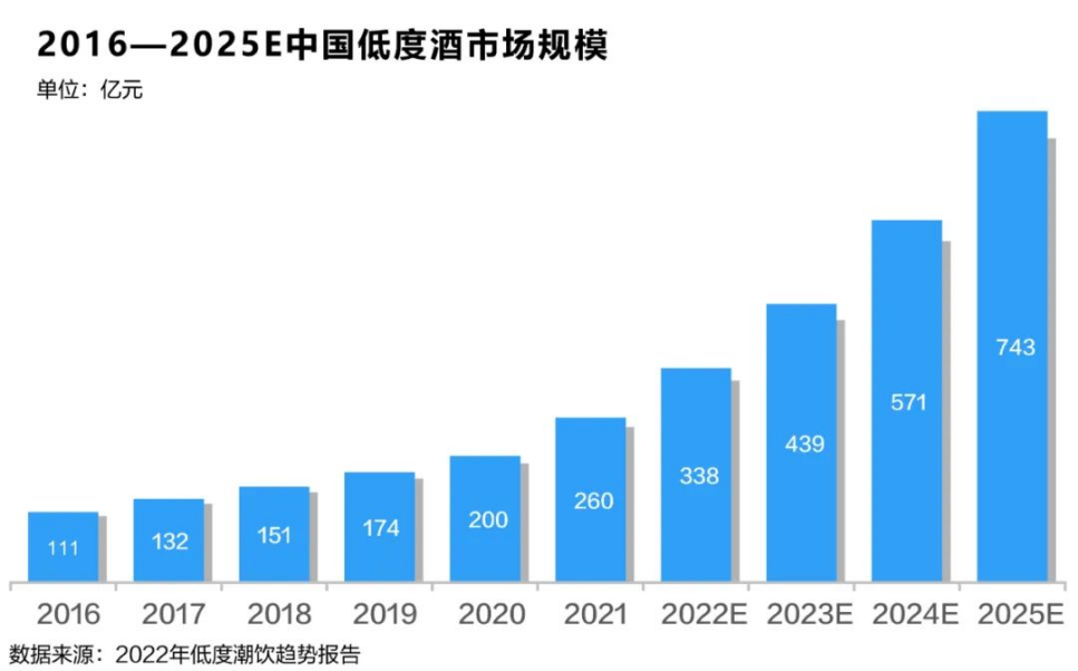 另有相关数据显示,低度酒市场规模预计在2025年将达到742.6亿元,2021至2025年年复合增长率可达到30%。而低度数的气泡酒饮料,又具有低糖低卡、少碳水等特点,在不给健康增添负担的同时,还可以满足年轻人微醺放松的需求。