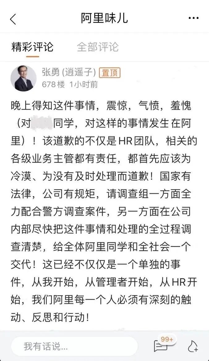 当事女性在8月7日发出公开信。8月8日凌晨,张勇在阿里内网发帖,表示震惊、气愤、羞愧,并为在这件事中各级主管的冷漠和没有及时处理道歉。8月9日凌晨,张勇在阿里内网公布了阶段性内部调查结果和处理决定。
