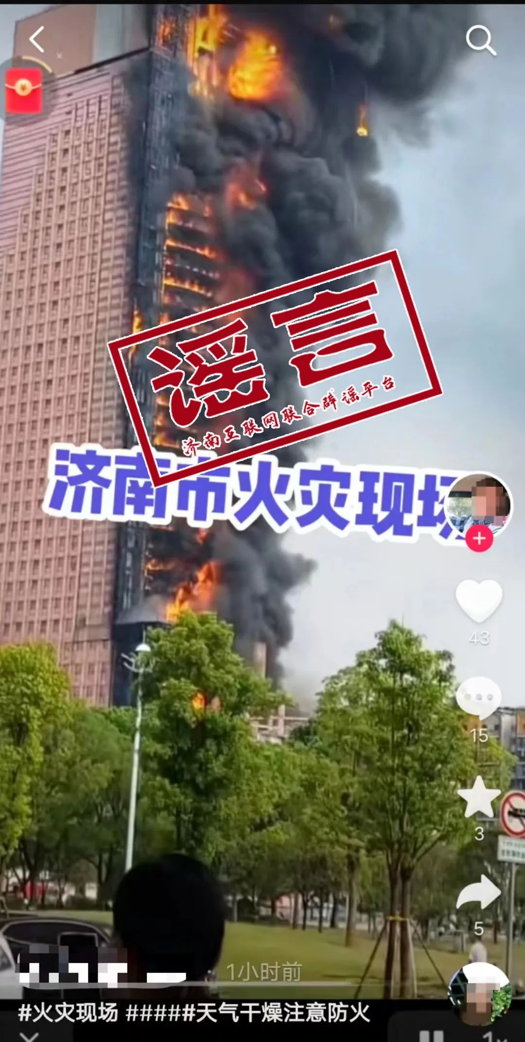 据“互联网联合辟谣平台”消息,9月11日,一则“济南市火灾现场”的视频在抖音等网络社交平台流传,引发网民关注。经与济南消防支队核实,消防部门未接到过类似火情,此消息纯属谣言。