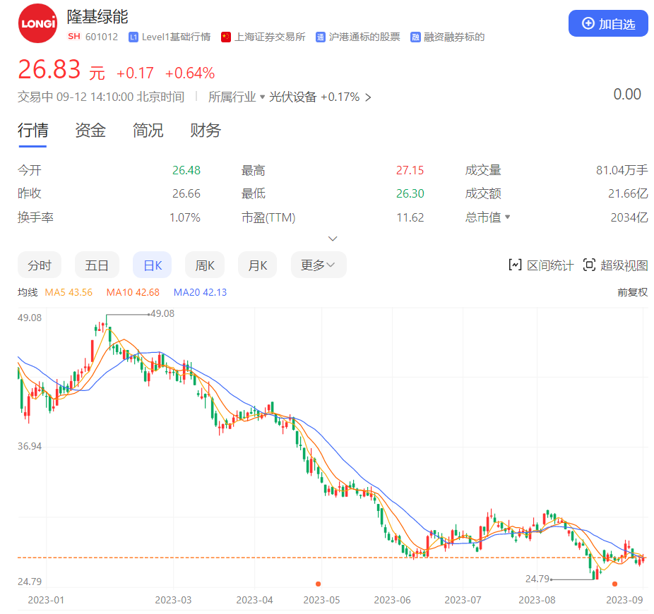 但有意思的是,隆基自身仅在业绩说明会当天收获了4%的上涨,最高股价28.38元/股,截止9月11日收盘价为26.66元/股,已经跌去了6%。