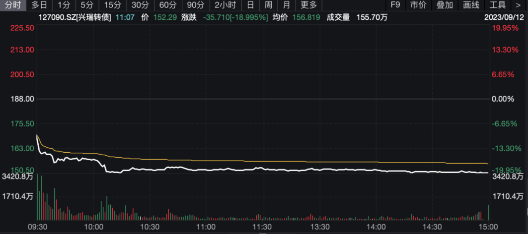 9月11日,兴瑞转债刚刚上演了一波“高台跳水”,兴瑞转债以246.22元开盘后在10:36分一度涨至276.6元,但在此后的23分钟内,兴瑞转债一路跳水至暴跌20%至188元,而且在收盘时兴瑞转债仍有接近4万手封单。