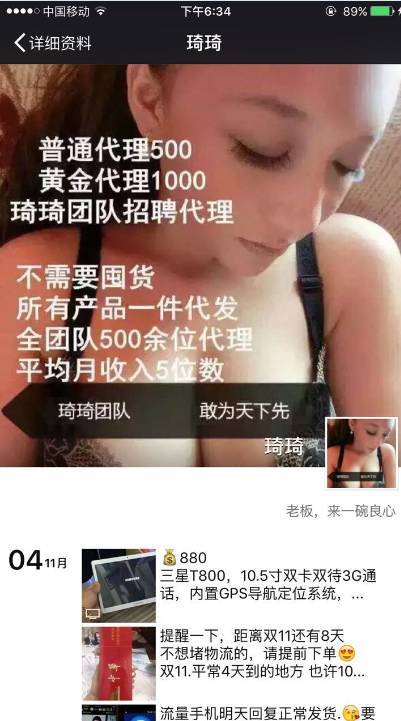 封面相册:精炼的话表述了代理政策,商业模式的展现,一看就是微商,平时朋友圈的内容,用户一看就知道是在卖货,对她感兴趣的人戳开她头像之后一张封面相册映入眼帘——收代理。