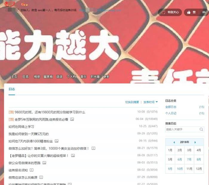微信公众号没出来的时候,很多人主要是靠推广他的QQ号结合QQ空间去做成交的。主要是通过QQ头像,个性签名+QQ空间内容布局(参照微信公众号菜单栏设置),解决你是谁,你是卖什么的,然后用一些干货证明你能提供这些东西,然后引出业务。