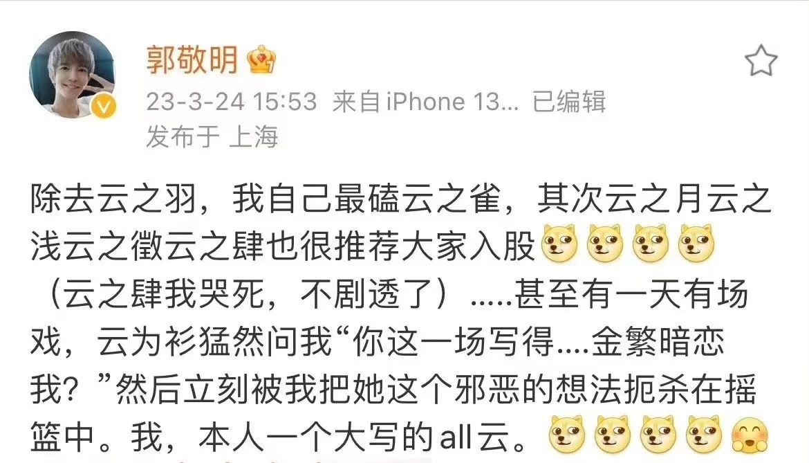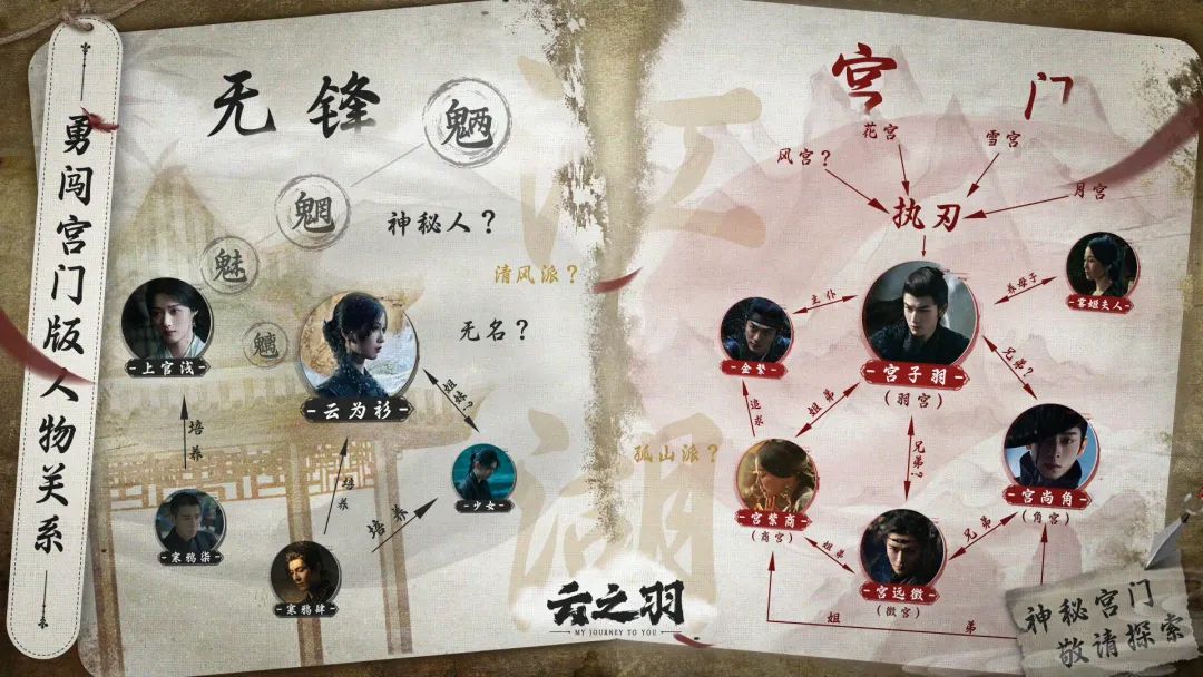 但观众依然能从《云之羽》的故事中窥见熟悉的影子:金靖的角色是类唐宛如的郭式喜剧角色,男二宫尚角和弟弟宫远徵感情深厚,能让观众嗑起骨科CP,甚至男主所在的家族都姓宫,这个姓氏在《小时代》里是权力和金钱顶端的象征,重要男配宫洺被广泛认为是郭敬明本人的理想具现化。