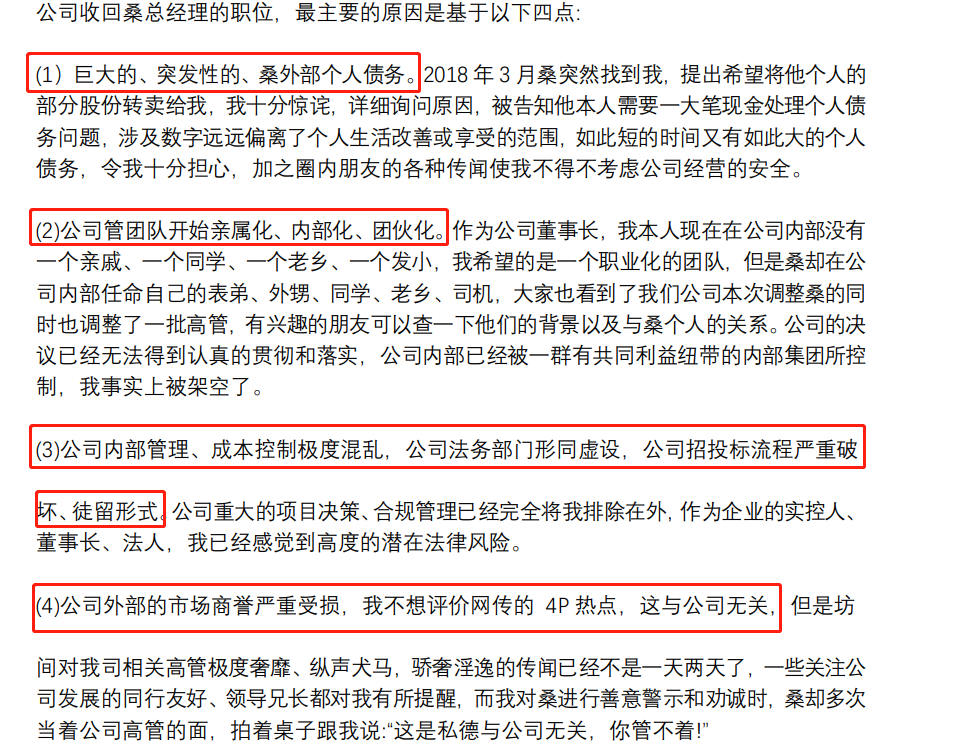 崔巍还列举了收回桑春华总经理职务的其他三个理由,包括公司高管团队亲属化、内部化、团伙化,自己被架空;公司内部管理、成本控制混乱,招投标流程被严重破坏;公司外部市场商誉严重受损,部分高管极度奢靡、纵声犬马。