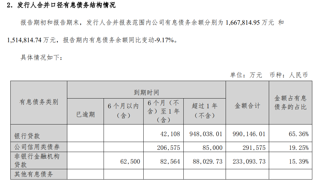 按发行人合并口径算,石榴集团2023年上半年末有息负债约151.48亿元,其中银行贷款约99.01亿元;公司债券约29.16亿元,非银行金融机构贷款约23.31亿元。