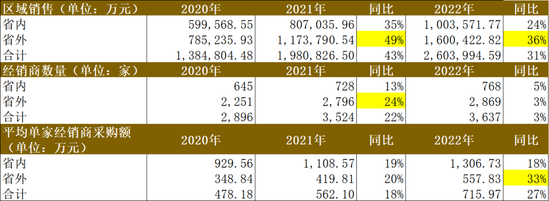 2020年到2022年,山西汾酒在山西省内和山西省外都取得了不错的增长,其中省外销售收入增速更快,2021年、2022年分别增长49%、36%,这与它在2021年大量增加代理商有关。