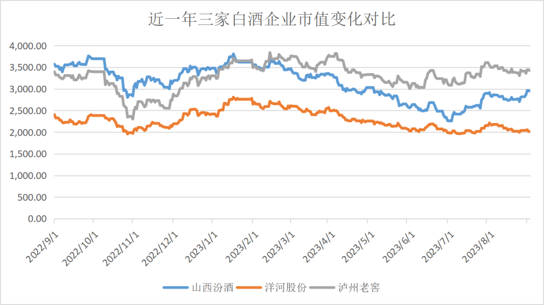 截至2023年9月12日,白酒龙头贵州茅台(600519.SH)市值2.29万亿,超过其他白酒上市公司的市值总和1.99万亿;五粮液(000858.SZ)凭借6200亿市值稳坐第二把交椅;这两者之下,山西汾酒(600809.SH)、泸州老窖(000568.SZ)、洋河股份(002304.SZ)均曾对“第三名”的位置发起过冲击。