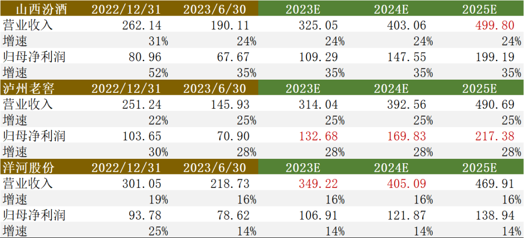 假设这三家公司在未来几年均按照2023年半年报增速增长,那么山西汾酒有望在2025年实现499.8亿元收入,超过泸州老窖和洋河股份;今年则有望在归母净利润指标上超过洋河股份。