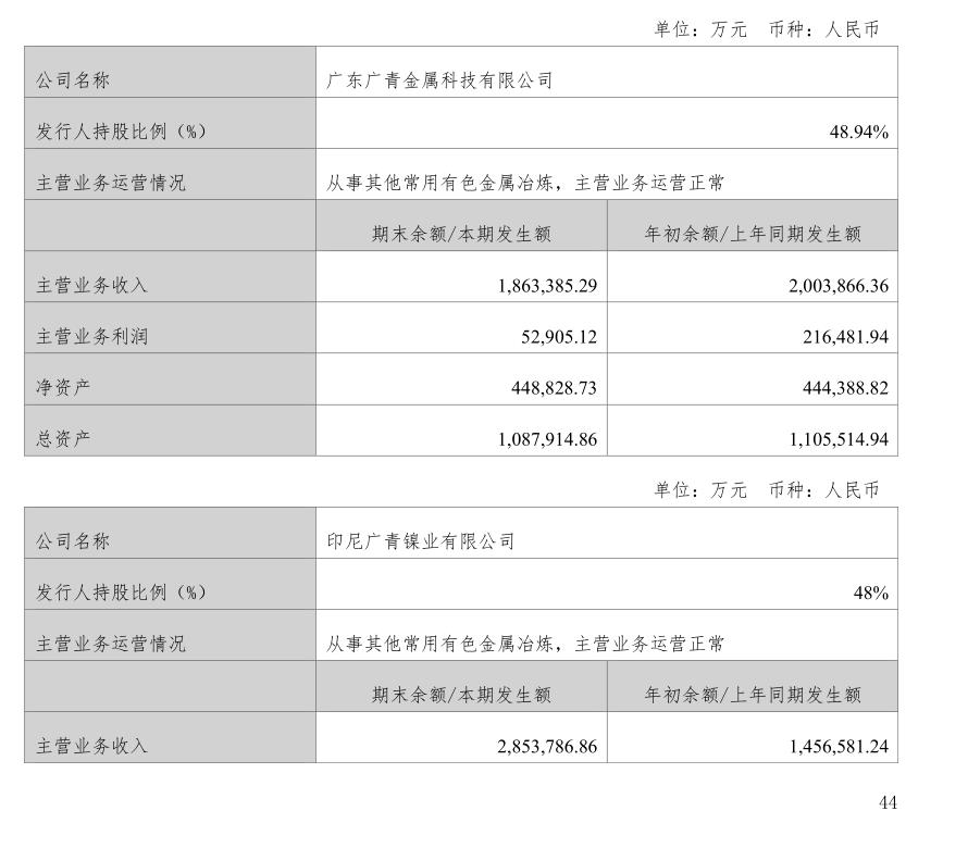 具体从印尼广青来看,该公司主要从事其他常用有色金属冶炼,总资产240.86亿元,其中广新控股持股比例为48%。从其上半年业绩来看,该公司上半年实现主营业务收入285.38亿元,实现主营业务利润6.23亿元。