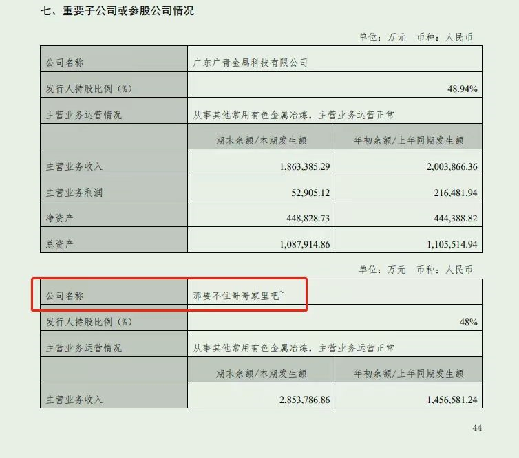 9月12日晚间,广新控股在深交所更新半年度报告,并提示“以此为准”。对比前后两份文件,在该半年报的第44页,此前写为“那要不住哥哥家里吧~”的子公司名称目前已更正为“印尼广青镍业有限公司”(下称“印尼广青”)。
