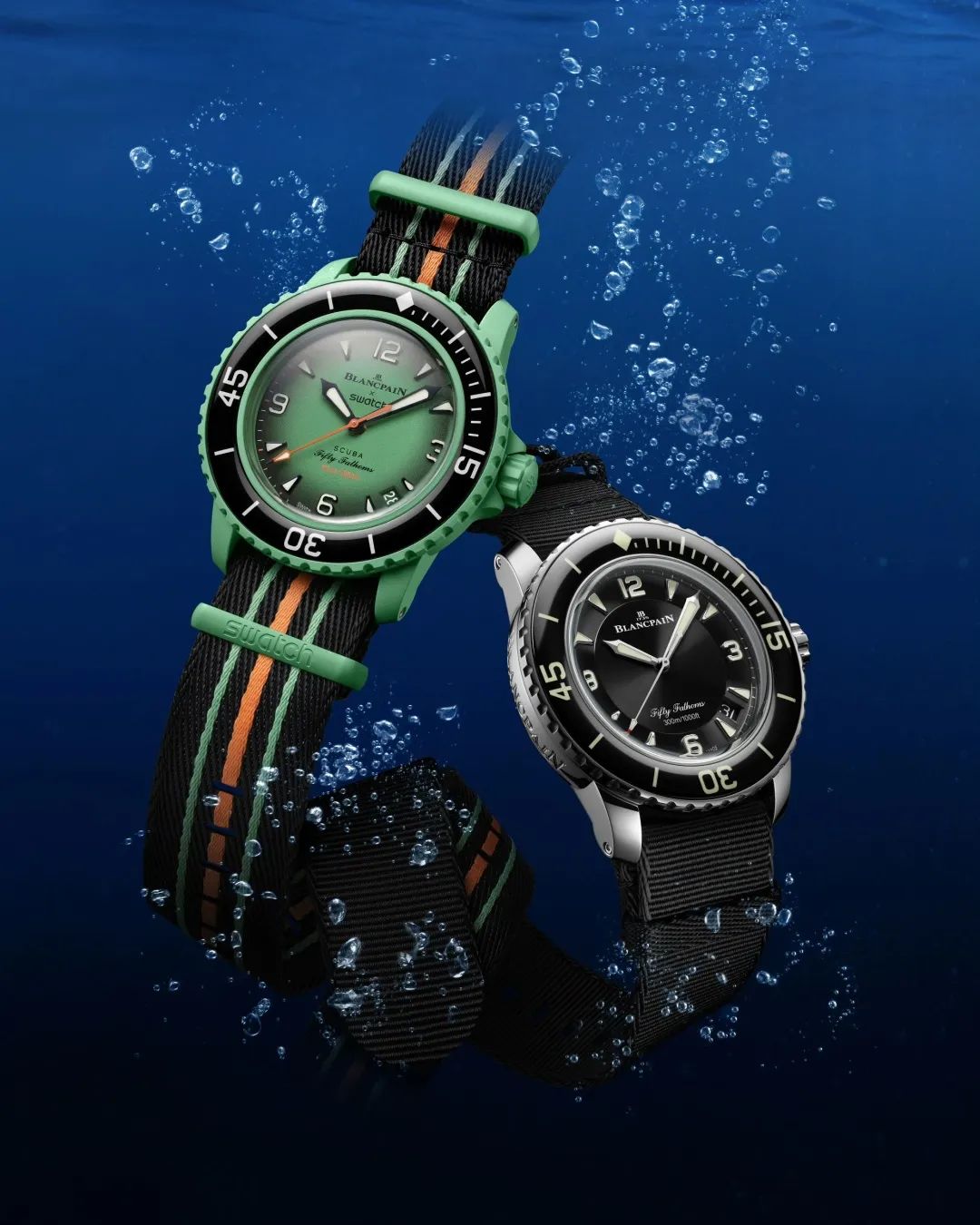 近日,宝珀携手斯沃琪,以诞生于70年前的BLANCPAIN Fifty Fathoms宝珀五十噚系列为灵感,打造了5款全新 Bioceramic Scuba Fifty Fathoms创新性植物陶瓷五十噚系列潜水表。