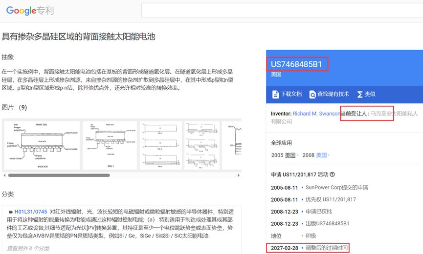 赶碳号查询到,BC电池的专利最早由SunPower在2005年8月获得,今年1月24日归属于TCL中环的子公司Maxeon。该专利最早将于2026年12月20日到期,但已延长至2027年2月28日。