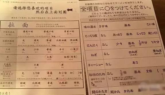 在一兰吃拉面,服务员会递给你一张纸,纸张上面写着:口味的浓淡、油膩的程度、大蒜、葱、叉烧肉、特制调味汁、面条的硬度等等,顾客只需要在表格里面打O,便可以自己决定自己拉面的口味。
