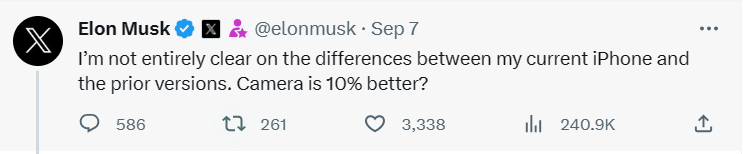 这似乎印证了特斯拉CEO马斯克一周前在社交平台X(原Twitter)上的暗讽:“我不清楚我现在的iPhone和之前的版本有什么不同,相机好了10%?”