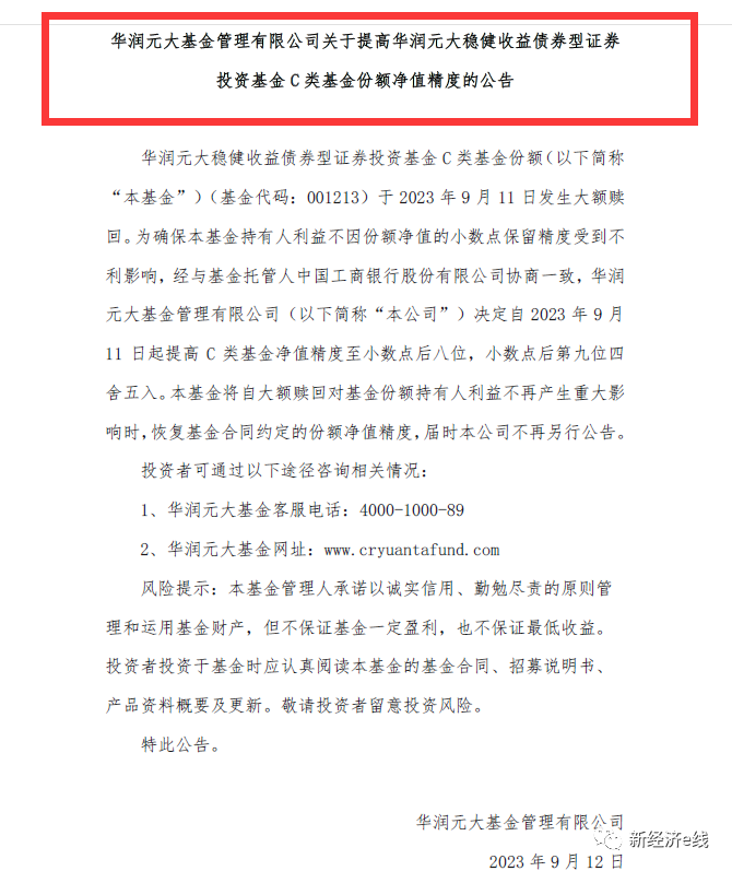9月12日,华润元大基金发布公告称,华润元大稳健C类基金份额于2023年9月11日发生大额赎回。为确保本基金持有人利益不因份额净值的小数点保留精度受到不利影响,经与基金托管人工行协商一致,公司决定自2023年9月11日起提高C类基金净值精度至小数点后八位,小数点后第九位四舍五入。该基金也为纯债基金。