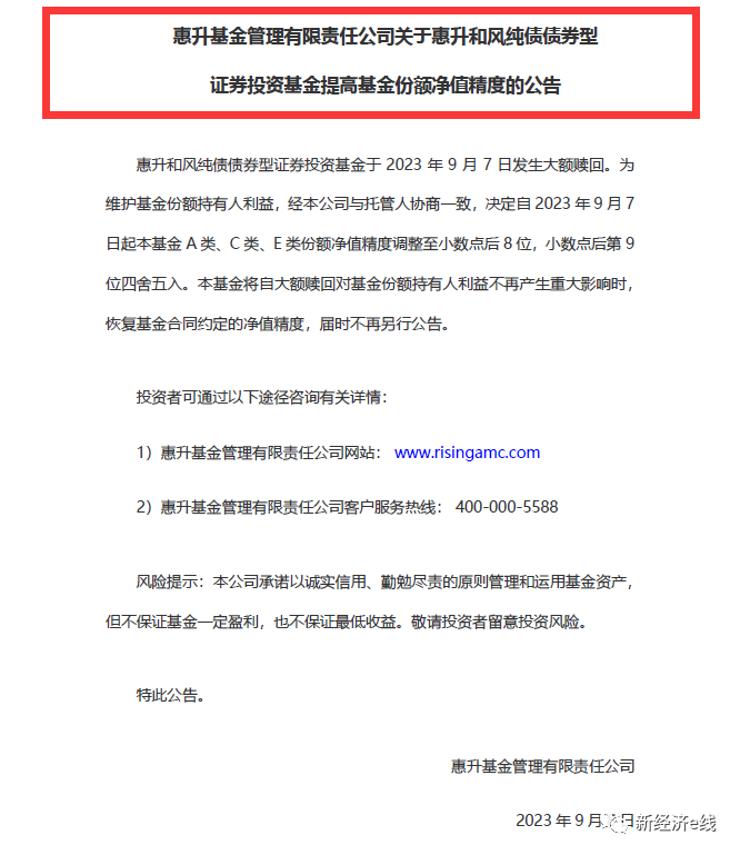 新经济e线获悉,受此影响,自8月底以来,债基已重现巨额赎回潮。9月8日,惠升基金发布公告称,惠升和风纯债于2023年9月7日发生大额赎回。为维护基金份额持有人利益,经公司与托管人协商一致,公司决定自2023年9月7日起基金A类、C类、E类份额净值精度调整至小数点后8位,小数点后第9位四舍五入。该基金单位净值变化也表明,受此影响,惠升和风E单位净值更是飙涨80%至2.0000元。
