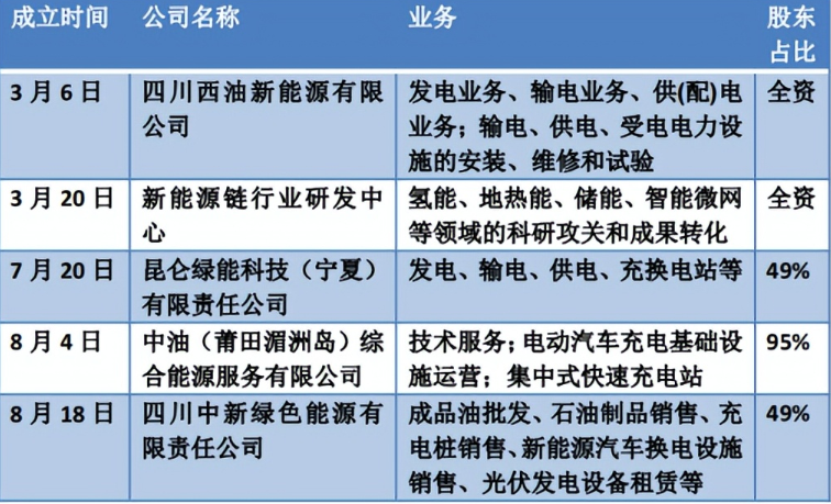今年以来,中国石油又成立了5家新公司和研究中心,其中4个与补能相关。比如3月6日,中国石油全资成立了四川西油新能源有限公司,公司业务就包括发电、输电、供电业务等。