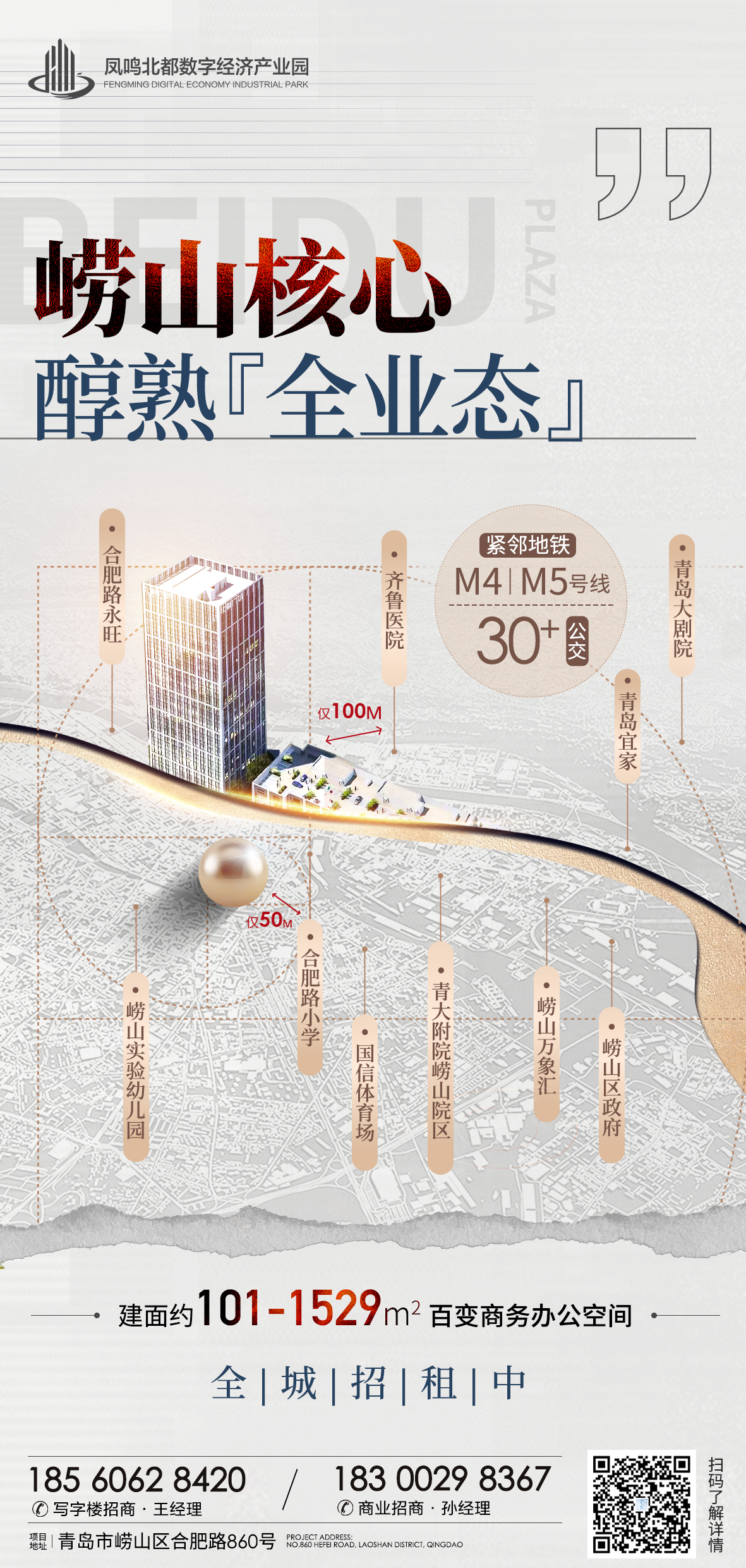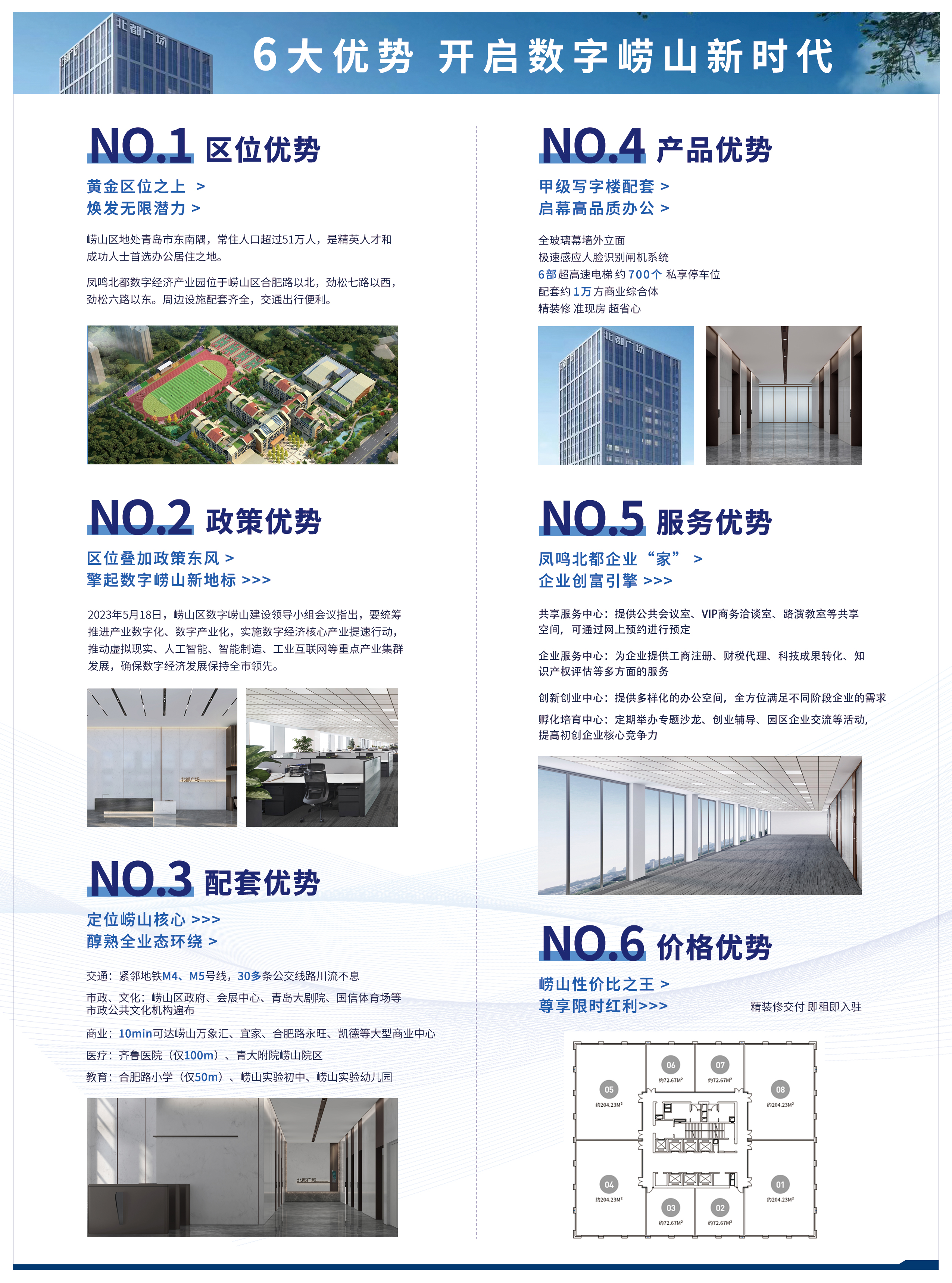 凤鸣北都数字经济产业园位于青岛市崂山区合肥路以北,劲松七路以西,劲松六路以东。整个项目的总建筑面积约50000㎡,由一栋甲级写字楼和2层商业组成。作为青岛招商引资的重要载体,可充分匹配总部机构的办公经营需求,甲级写字楼共23层,面积约35000㎡,每层面积约1470㎡,可分割成101㎡起租。