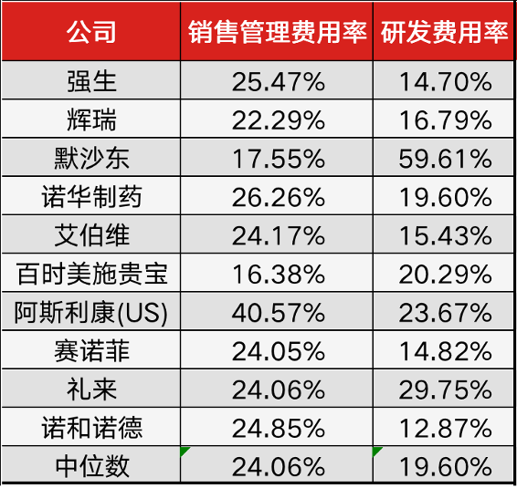 如下图所示,海外药企巨头销售管理费用在营收中的合计占比约在16%-40%之间,中位数为24.06%。即,海外成熟药企中,约四分之一的营收花费在企业日常运营管理和营销,研发费用的支出则是五分之一,研发与销售费用基本持平,属于双轮驱动。