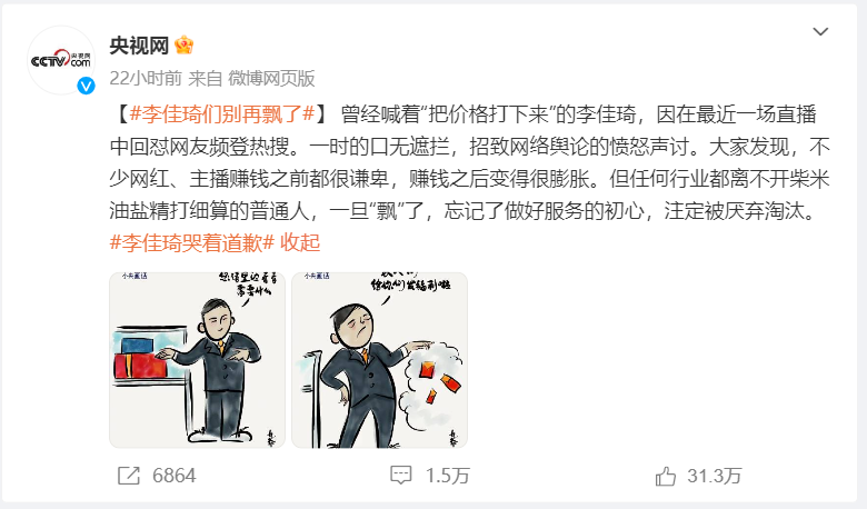 昨天,央视网评论指出:“不少网红、主播赚钱之前都很谦卑,赚钱之后变得很膨胀。但任何行业都离不开柴米油盐精打细算的普通人,一旦“飘”了,忘记了做好服务的初心,注定被厌弃淘汰。”