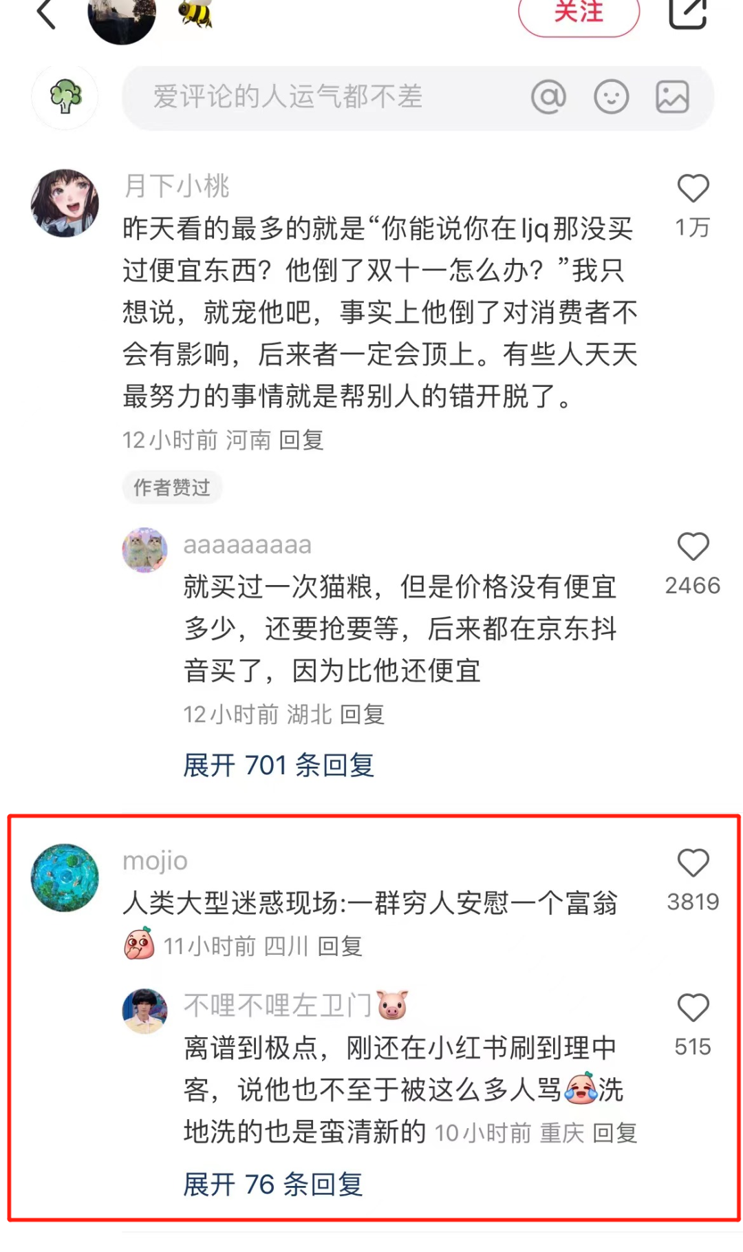 但正如有网友评论指出的——人类大型迷惑现场:一群穷人安慰一个富豪。