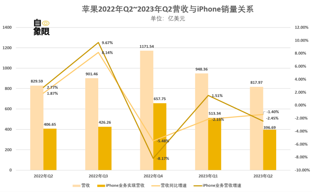 8月初,苹果发布2023财年三季度财报(2023年二季报),数据显示,苹果三季度营收817.97亿美元,不及上一财年同期的829.59亿美元,且较上一财季的948.36亿美元也大幅下滑。这是苹果连续第三个季度营收下滑。
