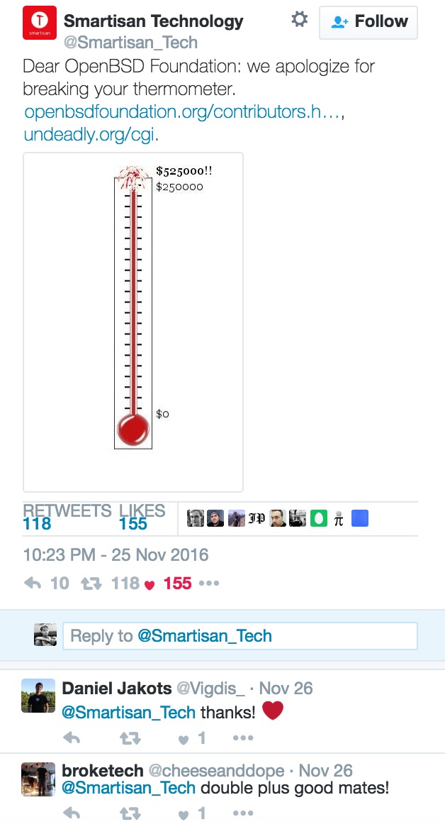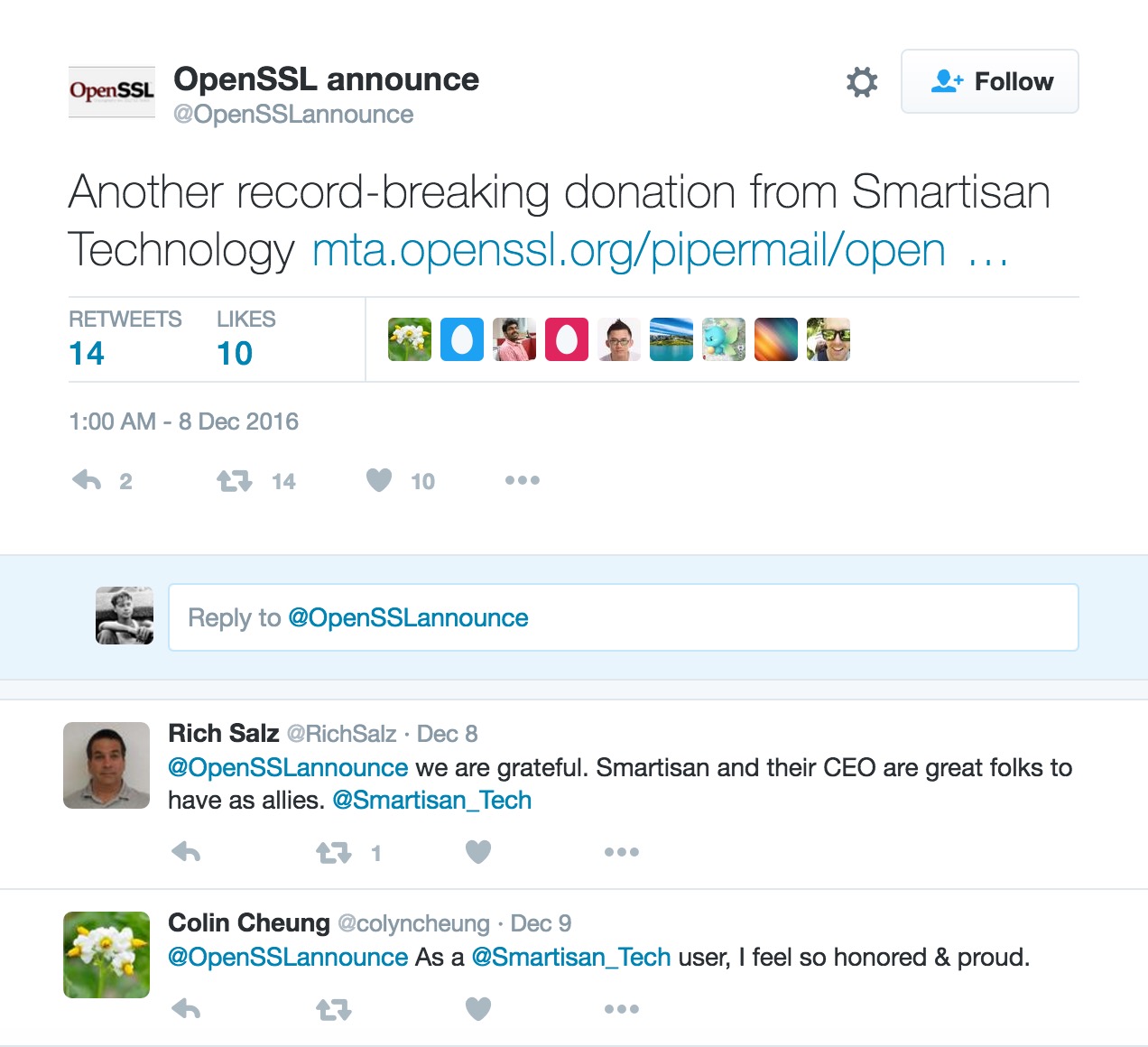而在OpenSSL、OpenBSD宣布收到捐款的官推下,以及锤子科技宣布消息的官推下,均有不少相信是国外开发者的Twitter用户向锤子科技表示感谢。