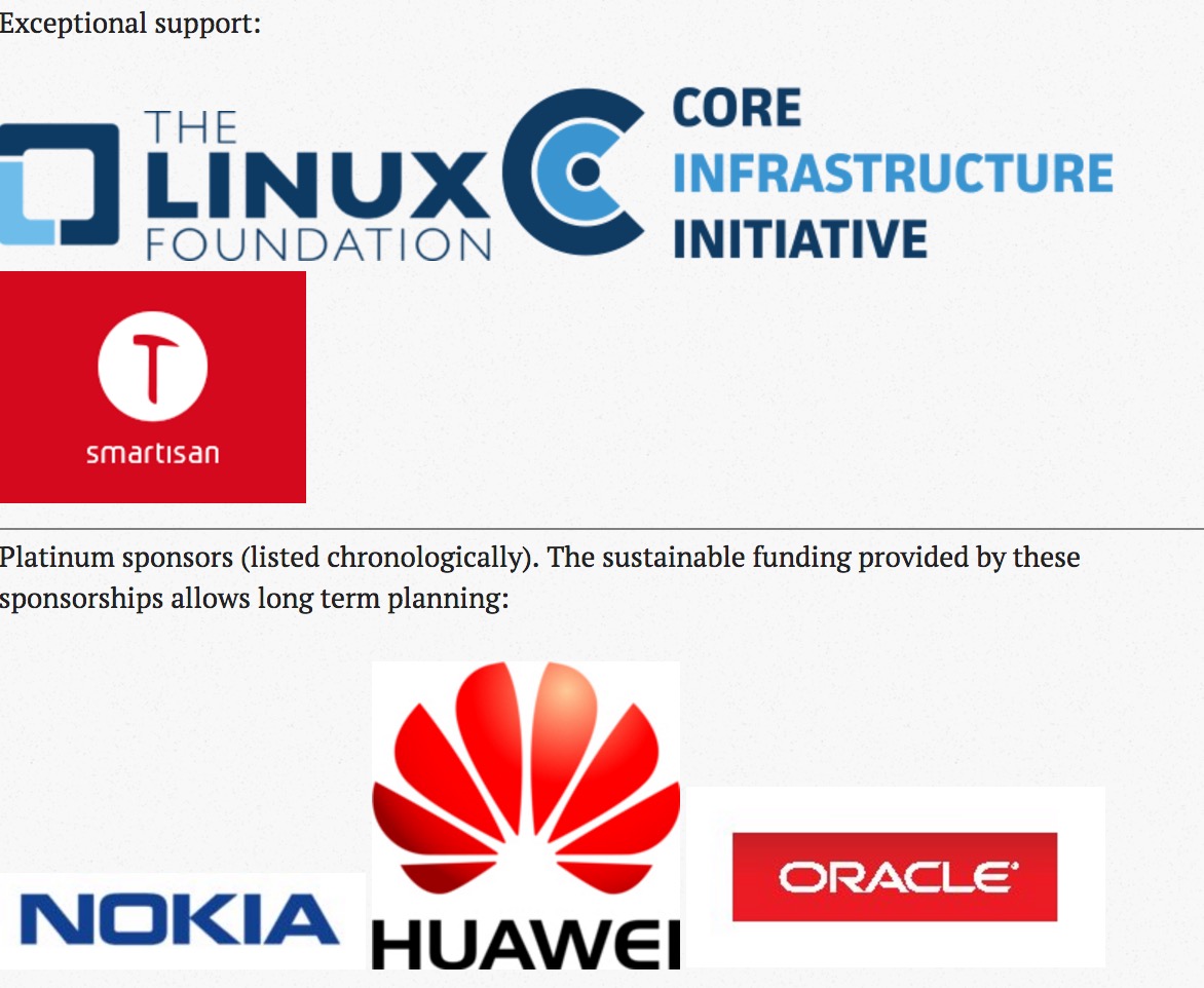 2014年首笔100万元人民币的捐款后,OpenSSL将锤子科技与华为、诺基亚均并列成为的“白金赞助商”(Platinum Sponsors)。本次捐款后,OpenSSL将锤子科技与“The Linux Foundation”和“Core Infrastructure Initiative”并列为更高级别的“卓越赞助商”(Exceptional Sponsors),OpenBSD更把锤子科技作为唯一一家企业列入最高档的铱金级别(Iridium)。