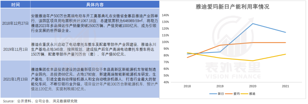 2015年行业销量持续下滑,就造成了工厂大面积停工:新日当年的产能利用率下滑至60%,雅迪从95%断崖式下滑到66%。