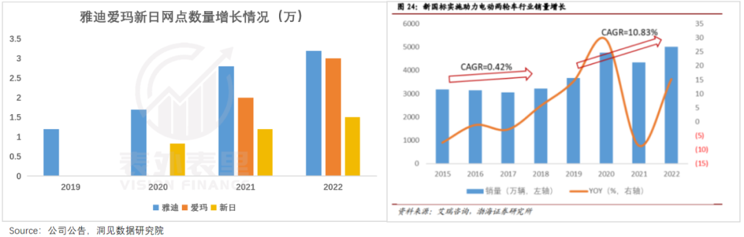 其枪口对准的“一街多商、一镇多店”,是近几年小电驴厂商大肆扩张的策略之一。可以看到,在此指引下,2022年雅迪、爱玛门店数均超过3万家,雅迪相比2019年几乎翻了3倍。