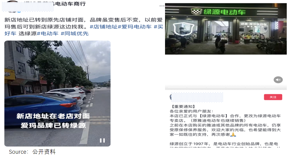 更有甚者,直接改做其他品牌生意。可以看到,社交平台上,经销商自爆雅迪改代理绿源、爱玛转战台铃等情况,愈发常见。