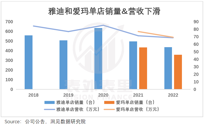 经销商首当其冲,如下图,雅迪爱玛单店销量和营收双双下滑,2020-2022年雅迪单店销量从560台下滑至437辆;爱玛同样严峻,去年单店销量同比直降17%。
