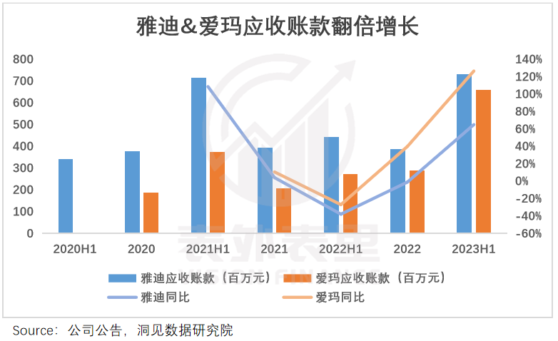 这无疑会反噬品牌,对销量造成冲击。为了鼓励经销商拿货,雅迪、爱玛都打起了“赊销”牌,上半年两家的应收账款都翻倍增长。
