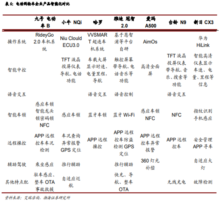 连九号、小牛掀起的高端智能化潮流,也没能逃脱被借鉴的命运。如下图,智能中控、车锁、APP 已然成为各家的标配。
