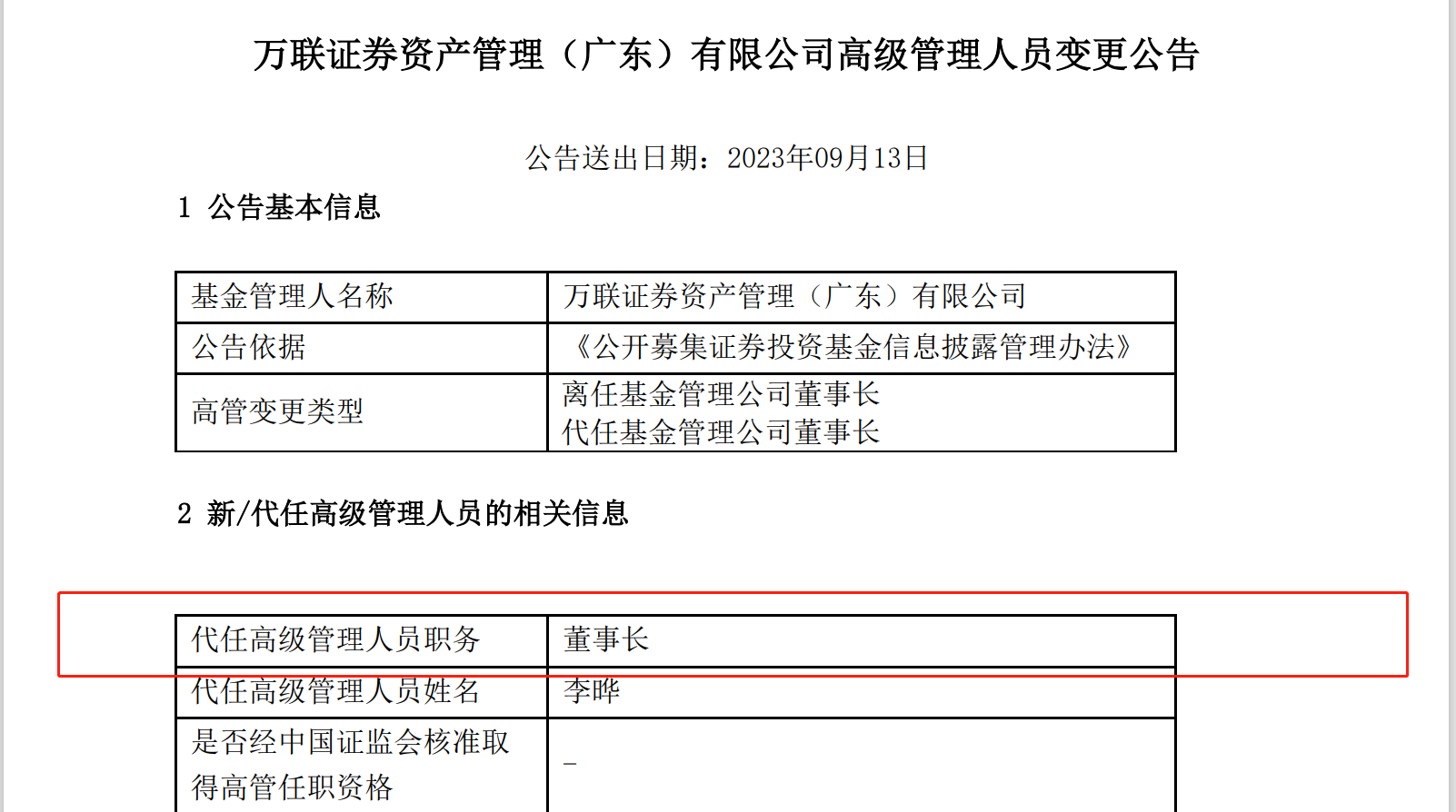 因个人原因,万联资管黄伟于2023年9月8日离任公司董事长职位,经第一届董事会第三次会议(临时会议)审议通过,公司现总经理李晔暂代董事长职位。