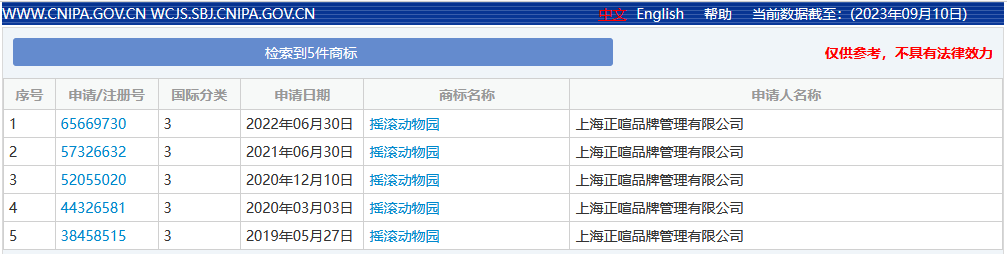 据中国商标网显示,摇滚动物园3类日化商标状态为已注册,申请人为上海正喧。此外,摇滚动物园天猫旗舰店、微信公众号的运营者认证主体也均为上海正喧。